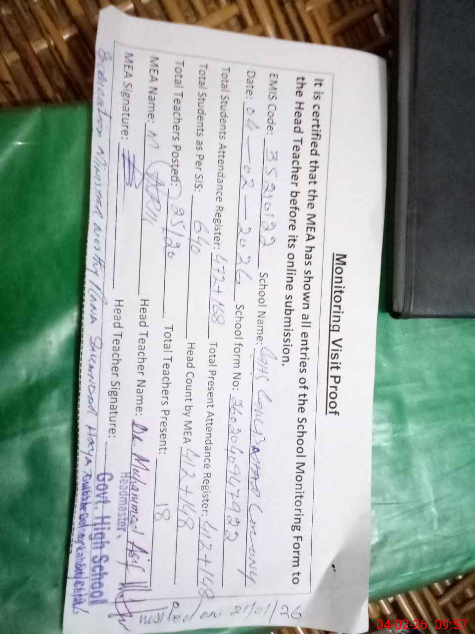 | Attendance Register | Head Teacher | MEA with School | Visit Proof |