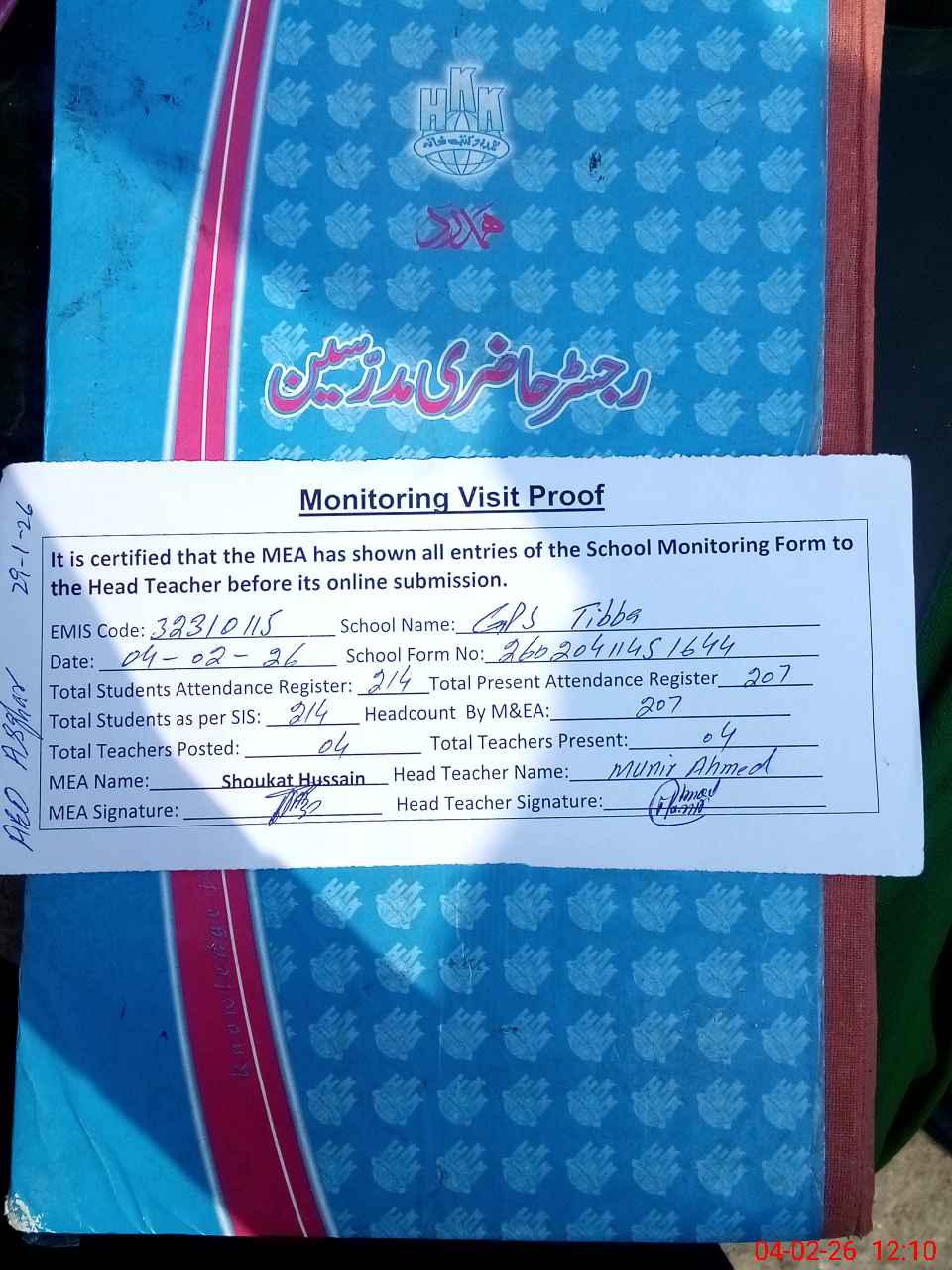 | Attendance Register | Head Teacher | MEA with School | Visit Proof |