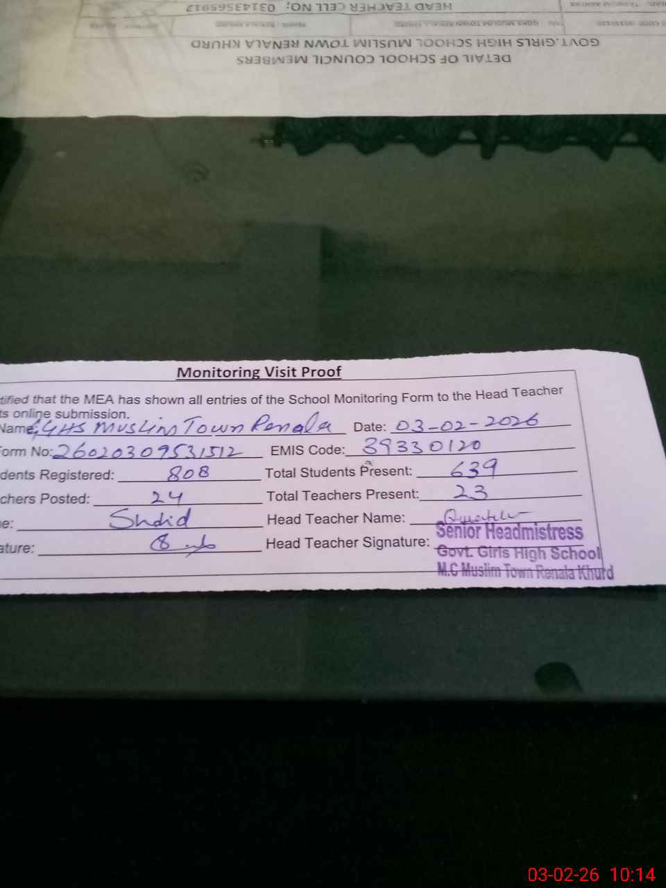 | EMIS Code: 39330120 | Name of School: GGHS MC MUSLIM TOWN RENALA KHURD | |||