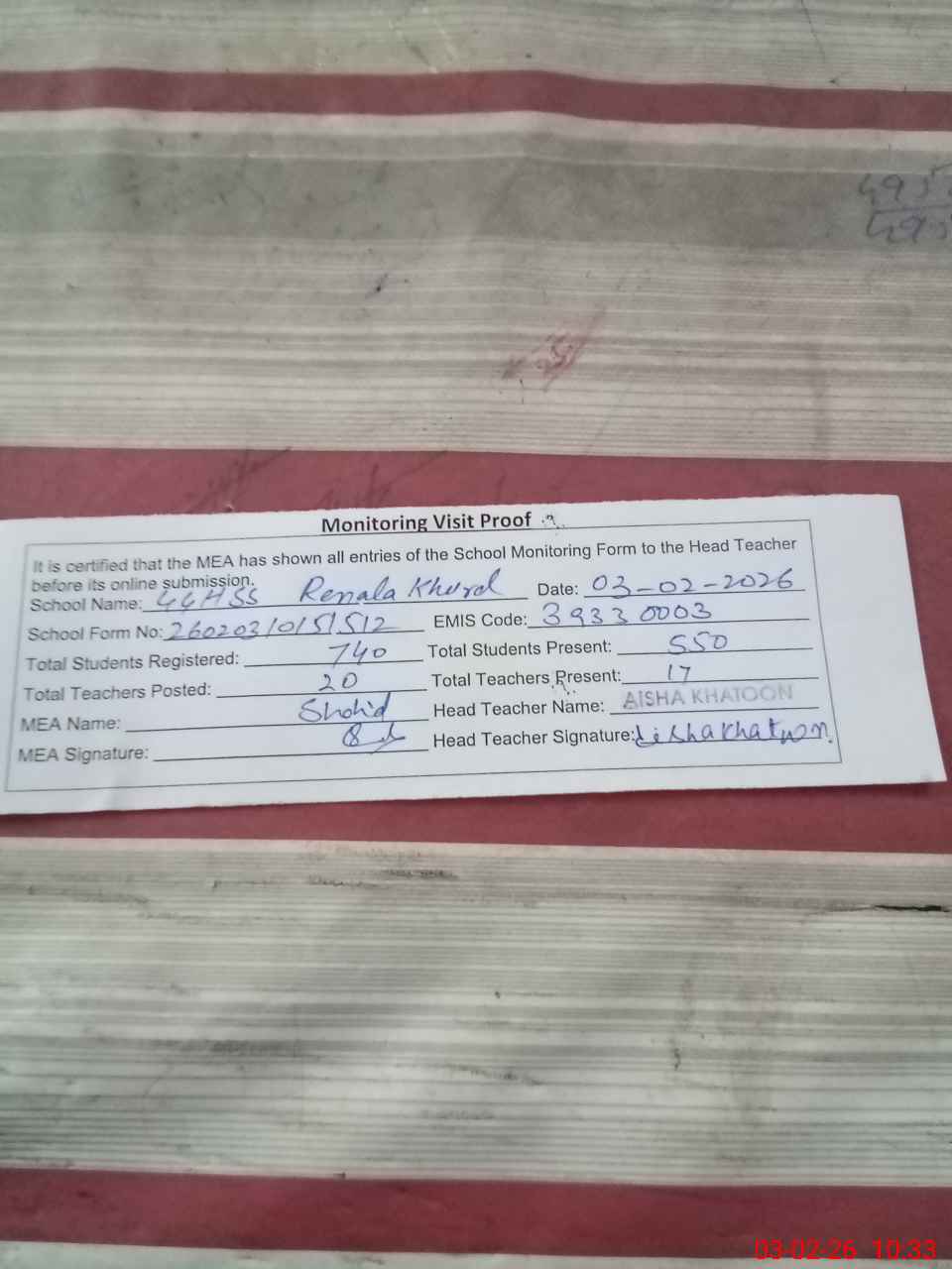| Attendance Register | Head Teacher | MEA with School | Visit Proof |