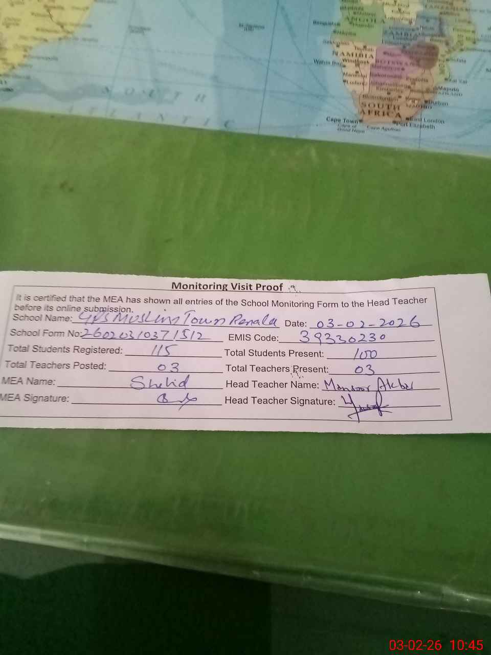 | Attendance Register | Head Teacher | MEA with School | Visit Proof |