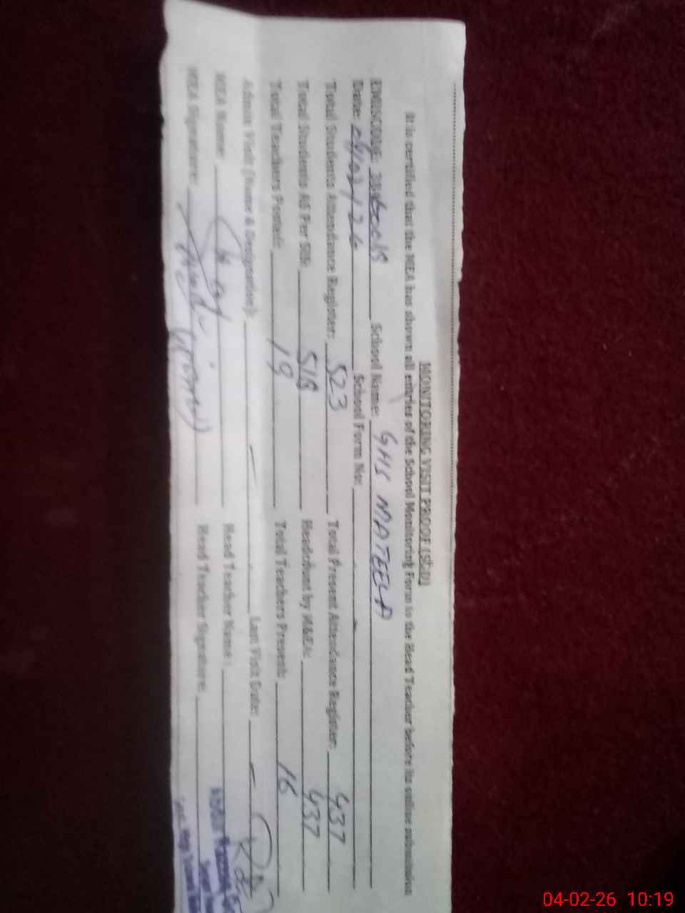 | Attendance Register | Head Teacher | MEA with School | Visit Proof |