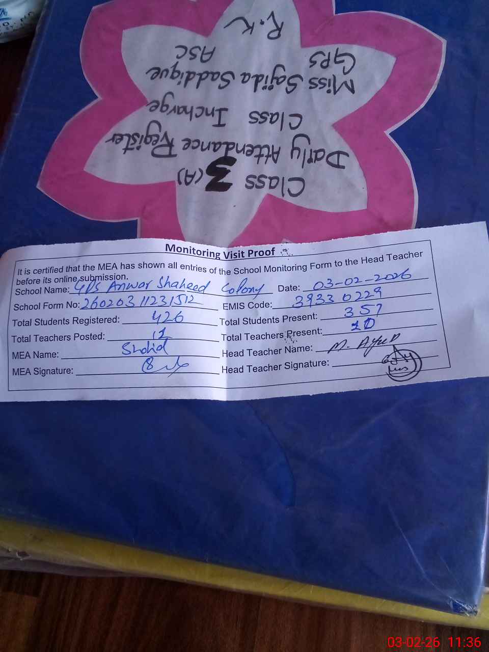 | EMIS Code: 39330229 | Name of School: GPS ANWAR SHAHEED COLONY | |||