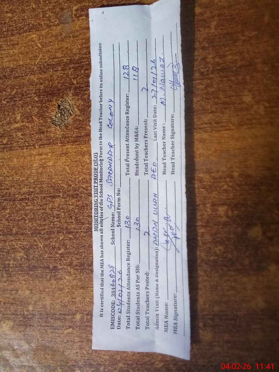 | Attendance Register | Head Teacher | MEA with School | Visit Proof |