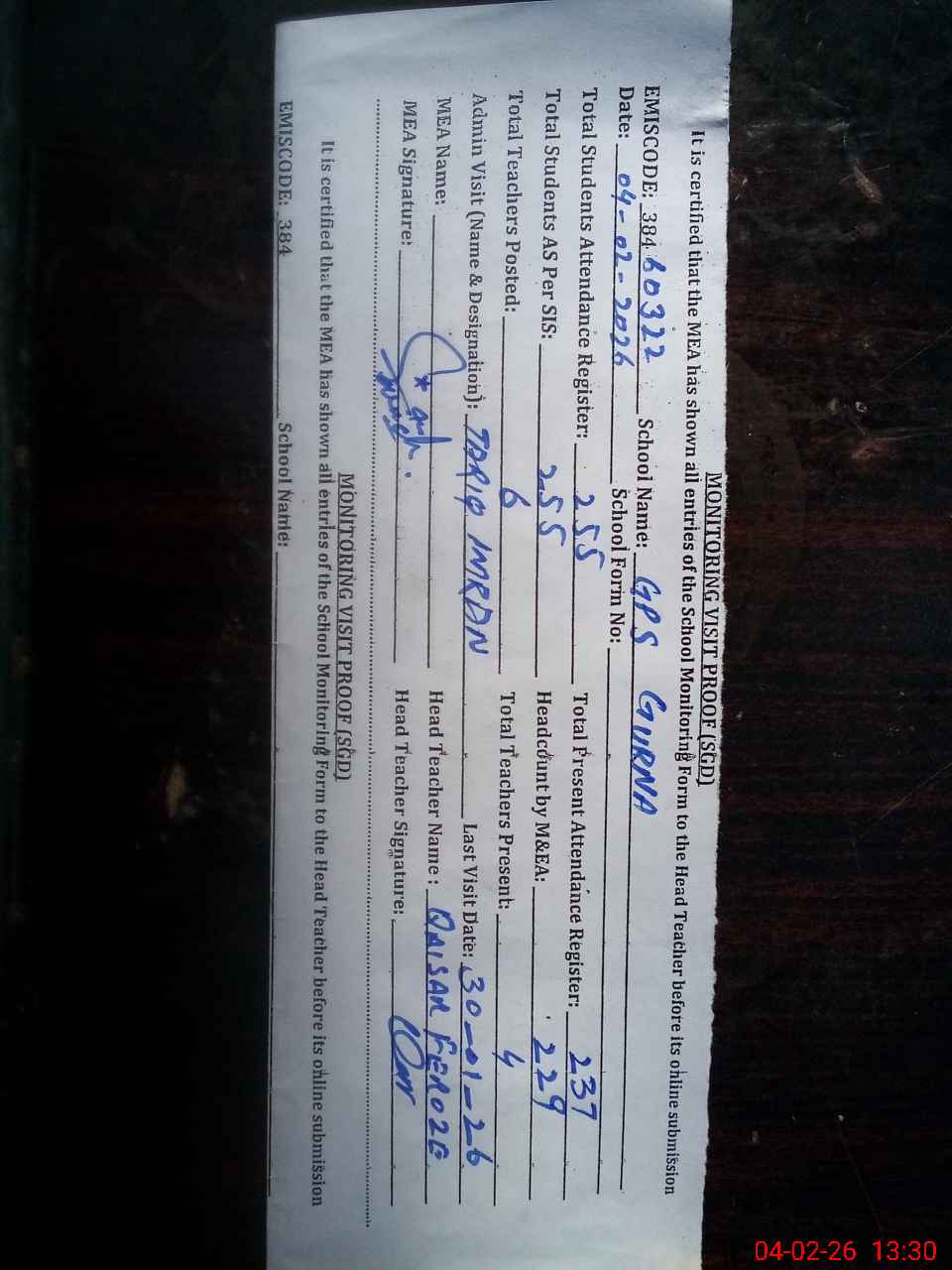| Attendance Register | Head Teacher | MEA with School | Visit Proof |