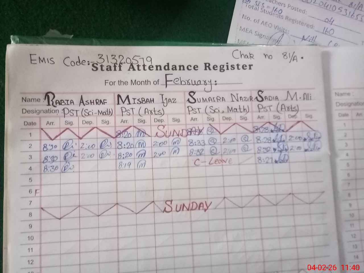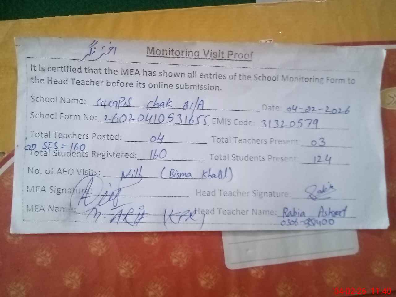 | Attendance Register | Head Teacher | MEA with School | Visit Proof |
