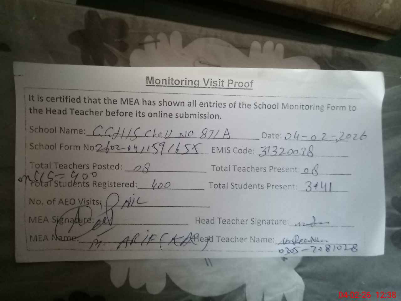 | EMIS Code: 31320038 | Name of School: GGHS CHAK 87/A LIAQAT PUR | |||