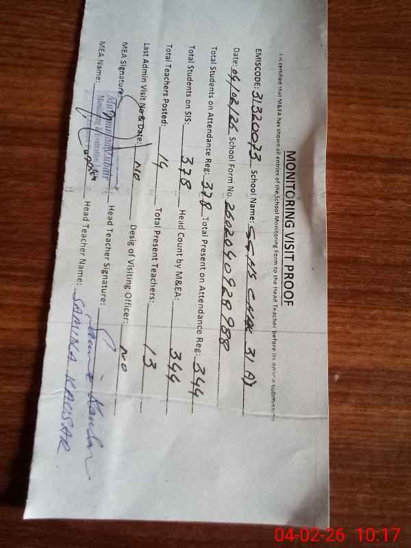 | Attendance Register | Head Teacher | MEA with School | Visit Proof |
