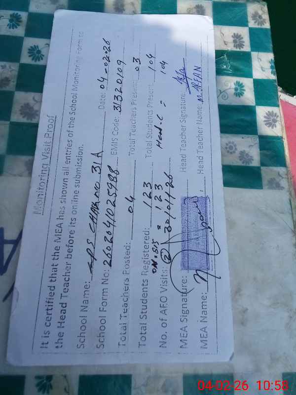 | Attendance Register | Head Teacher | MEA with School | Visit Proof |