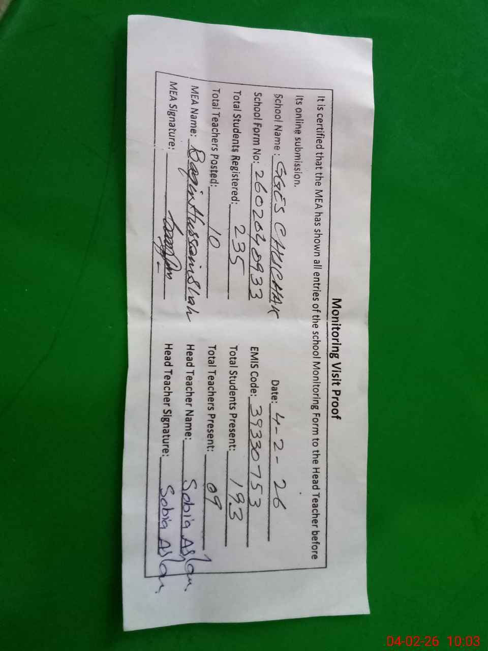 | Attendance Register | Head Teacher | MEA with School | Visit Proof |