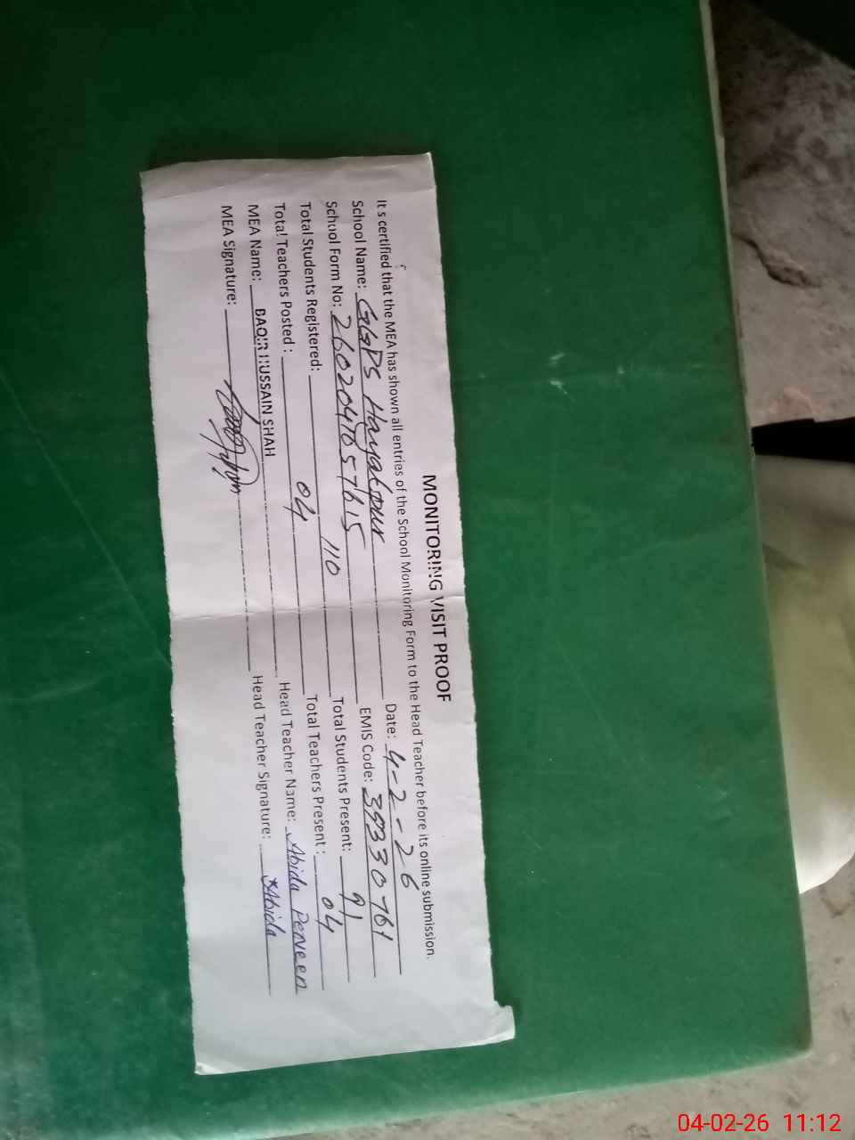 | Attendance Register | Head Teacher | MEA with School | Visit Proof |