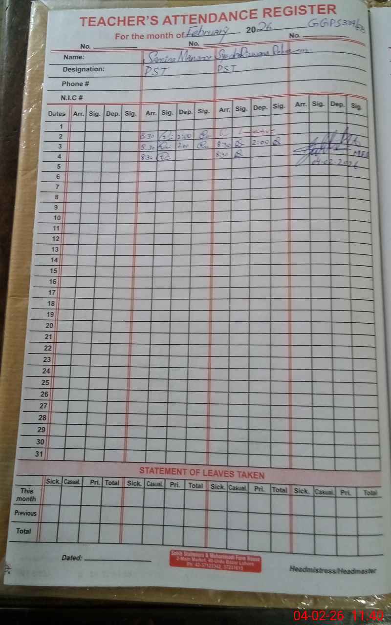 | Name: SA**** MA**** Designation: (School Headmaster's/Headmistress's) PST Phone/Cell Number: 03**** |
