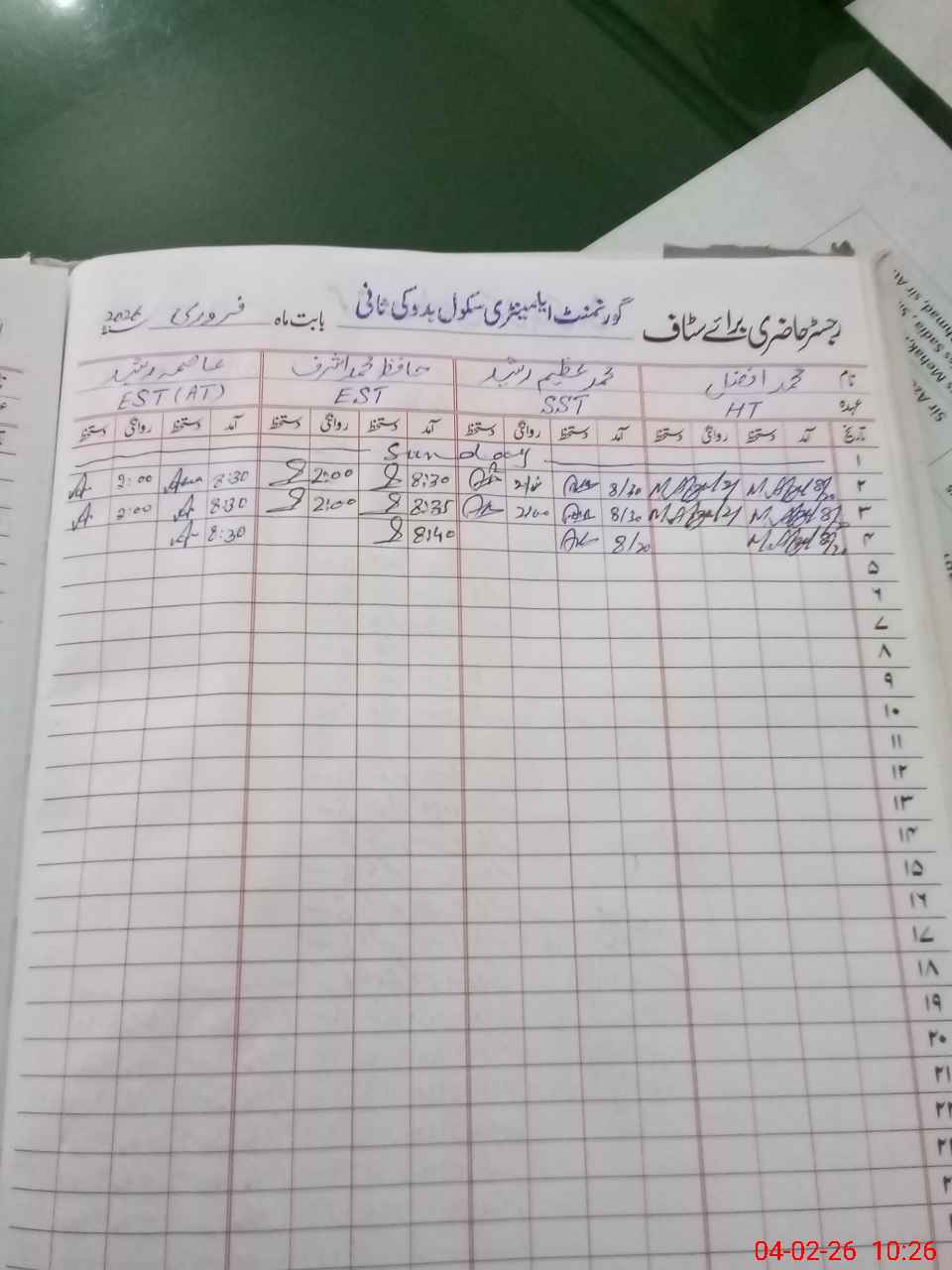 | Remarks (Use Separate Page if Required): 188 students difference in Roznamcha and head count Present students percentage is 63 percent Three toilets are under construction 35220165 | |||||
