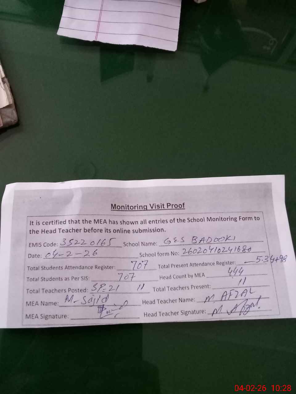 | Attendance Register | Head Teacher | MEA with School | Visit Proof |