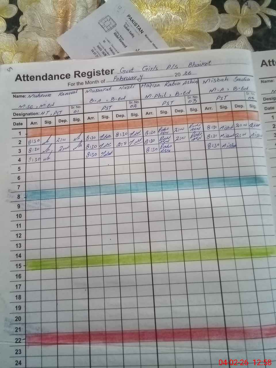 | CNIC | Full Name | Designation | R/C | Absence During Last Calender Month |
