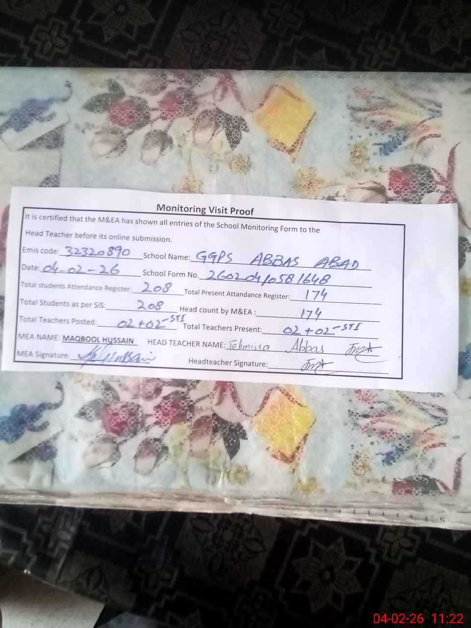 | Attendance Register | Head Teacher | MEA with School | Visit Proof |