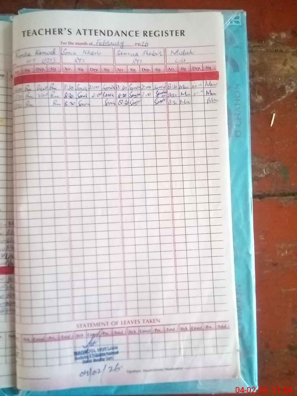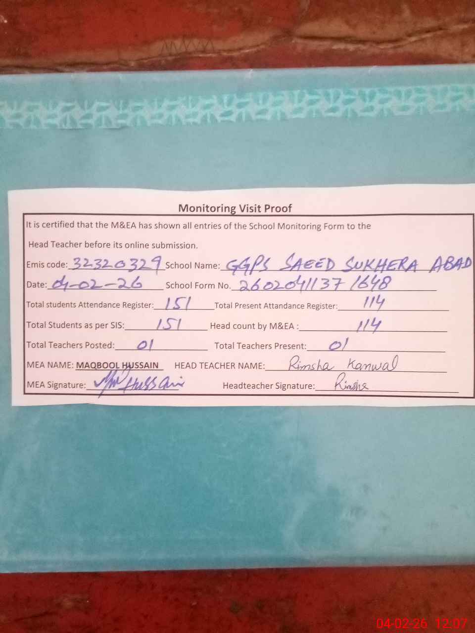 | Attendance Register | Head Teacher | MEA with School | Visit Proof |