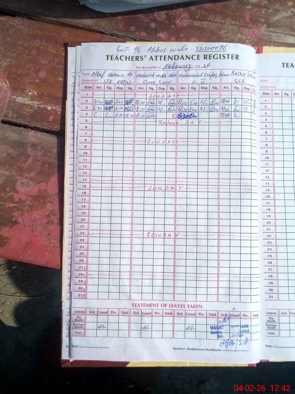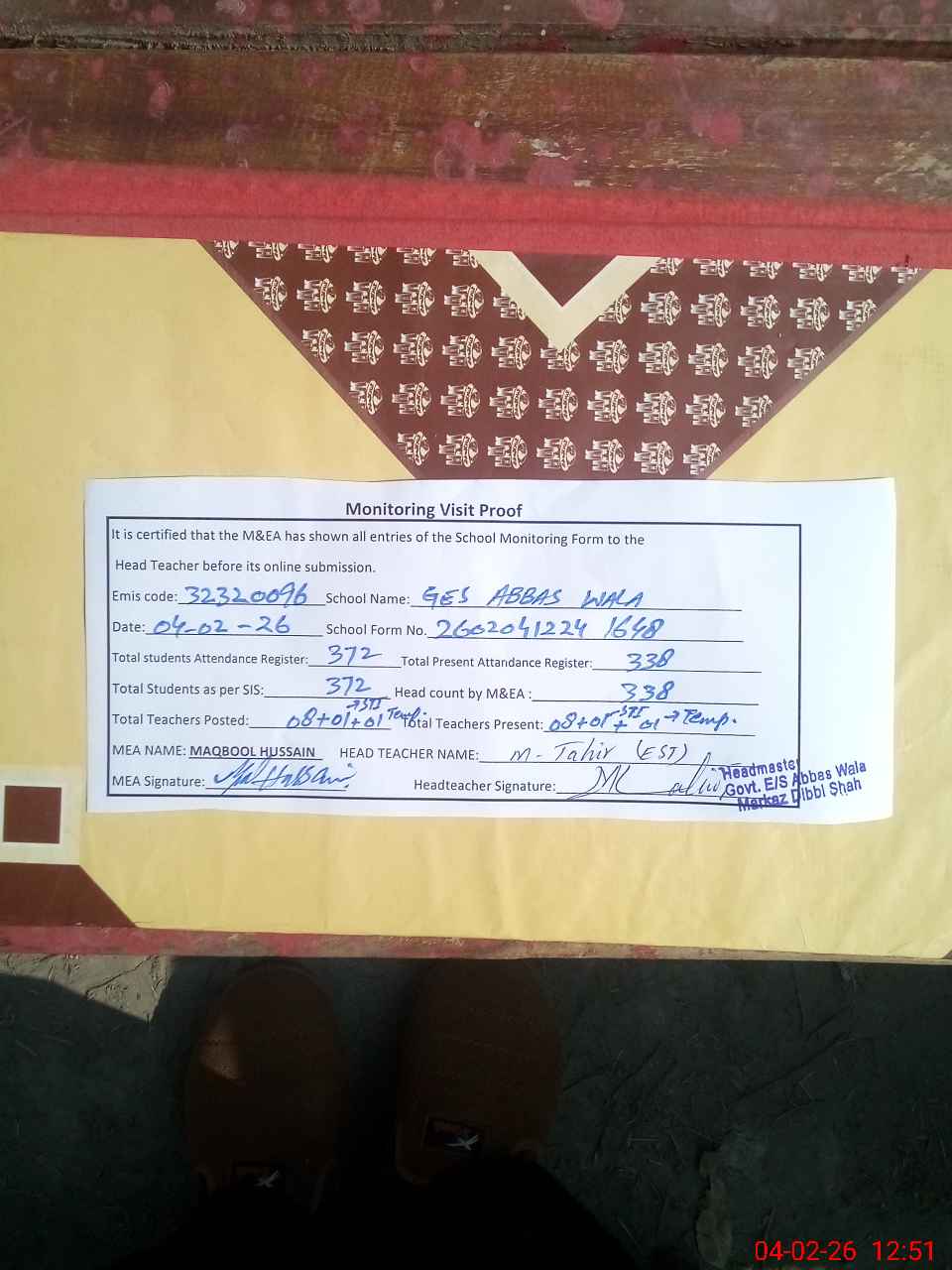 | Attendance Register | Head Teacher | MEA with School | Visit Proof |