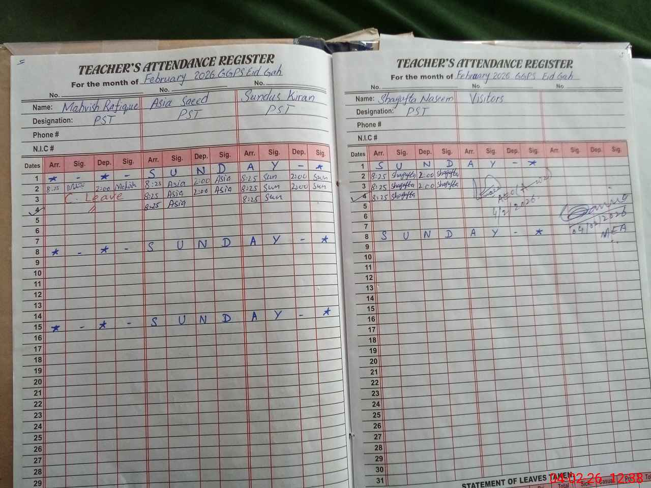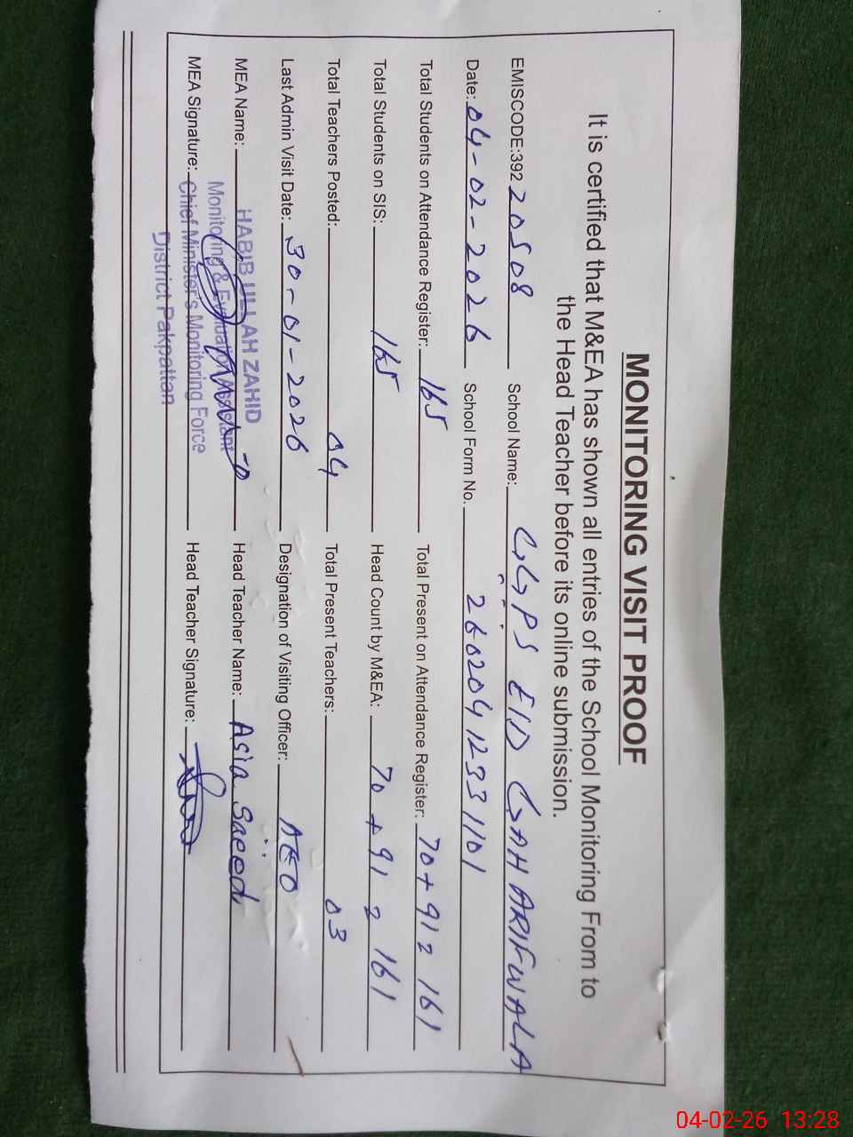 | Attendance Register | Head Teacher | MEA with School | Visit Proof |