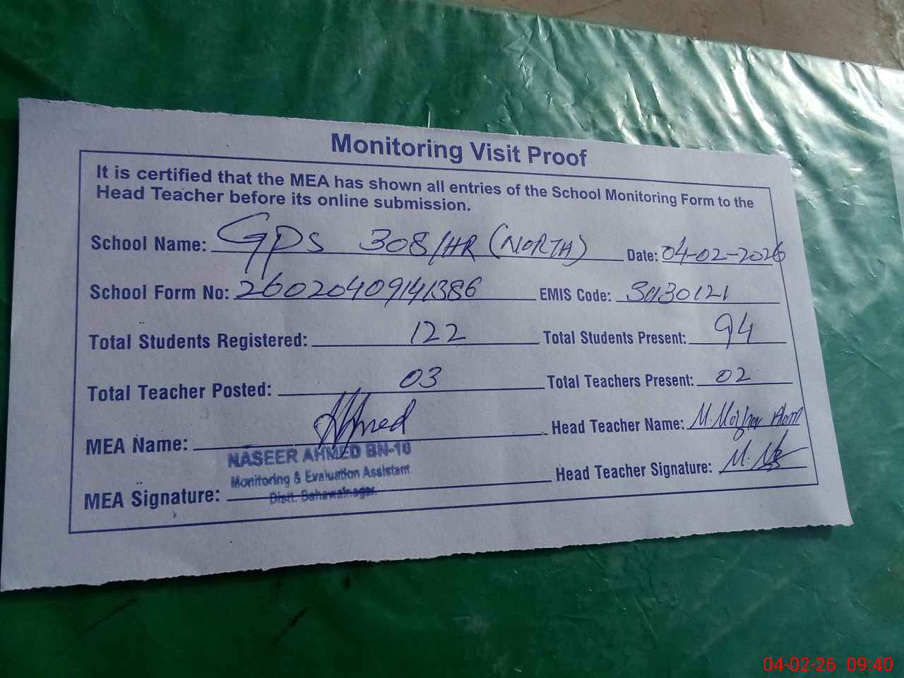 | Attendance Register | Head Teacher | MEA with School | Visit Proof |
