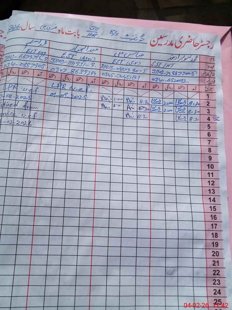 | CNIC | Full Name | Designation | R/C | Absence During Last Calender Month |