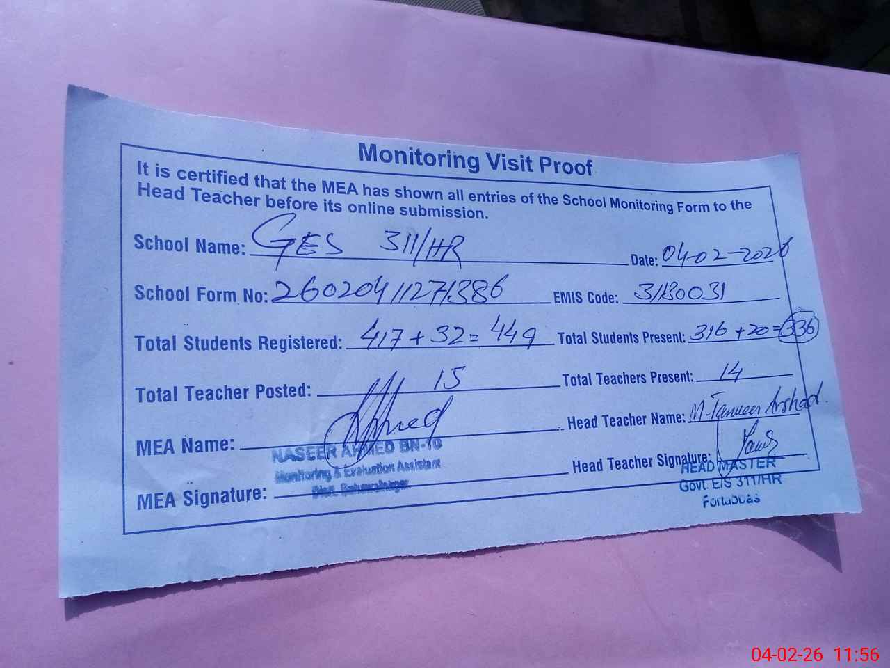 | Attendance Register | Head Teacher | MEA with School | Visit Proof |