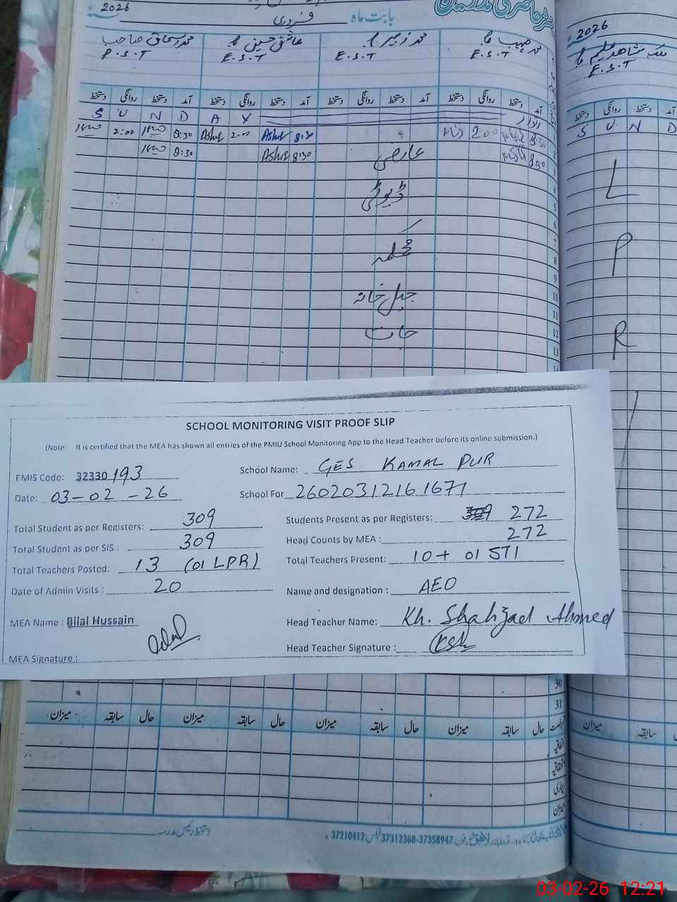 | Attendance Register | Head Teacher | MEA with School | Visit Proof |