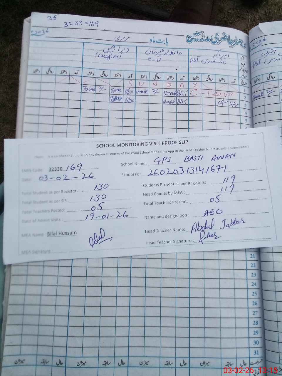 | EMIS Code: 32330169 | Name of School: GPS BASTI AWAN | |||