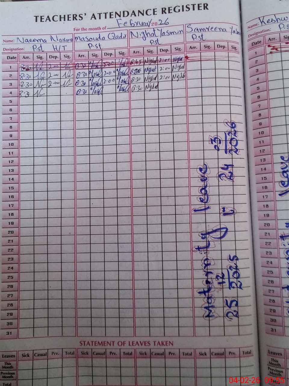 | 32**** | Sa**** Ya**** | PST Science/Maths | Regular | 0 | 0 | 0 | 0 | 0 | 0 | 0 | 0 | 0 | Maternity |