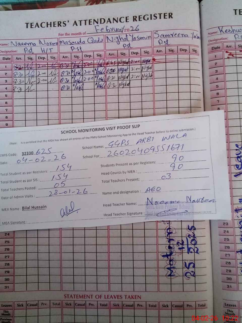 | Attendance Register | Head Teacher | MEA with School | Visit Proof |