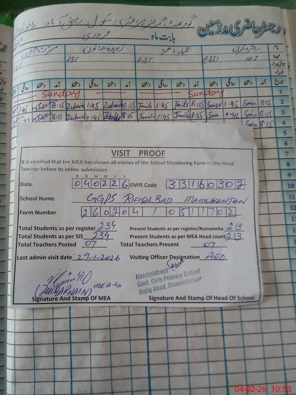 | Attendance Register | Head Teacher | MEA with School | Visit Proof |