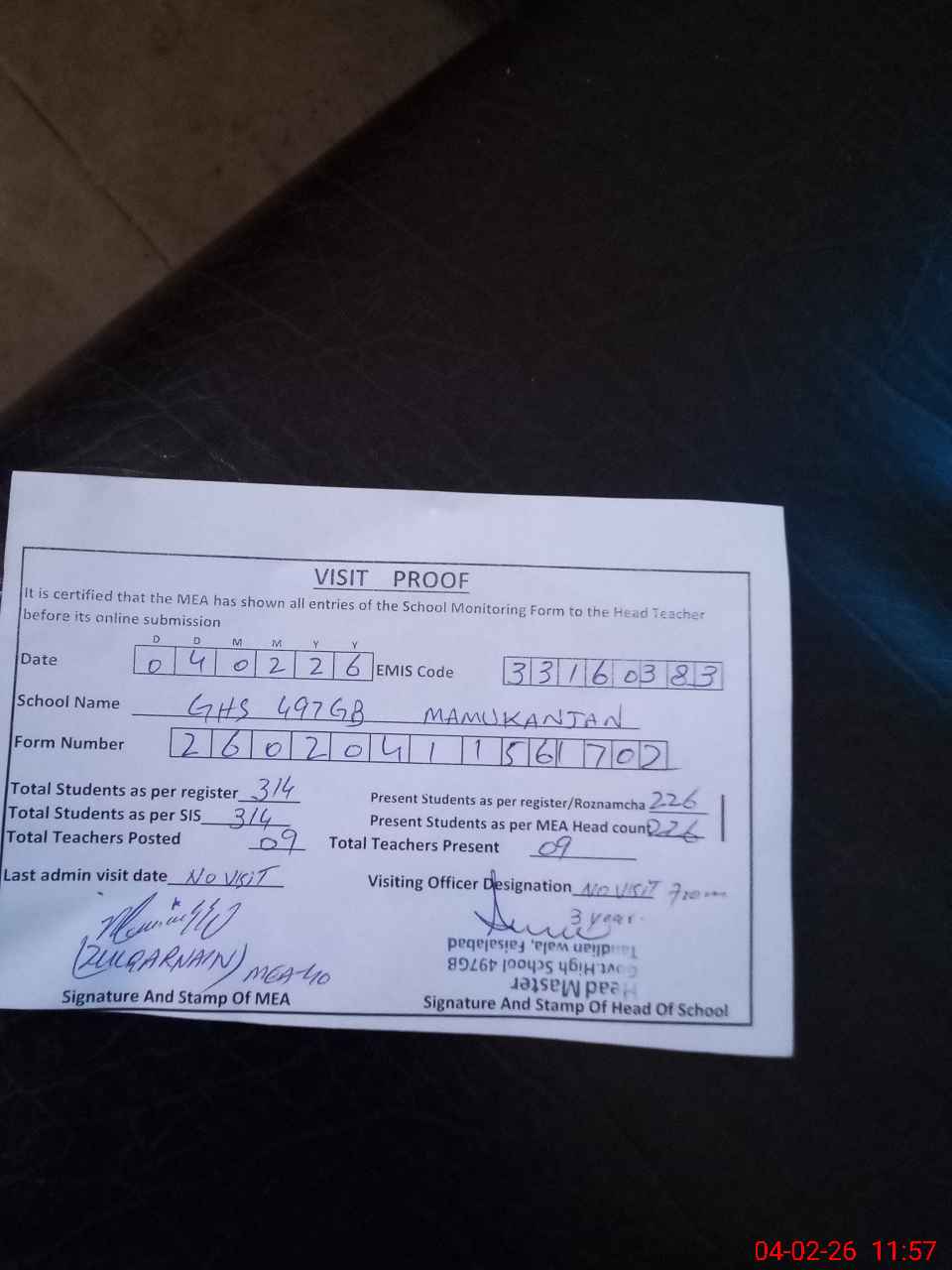 | Attendance Register | Head Teacher | MEA with School | Visit Proof |
