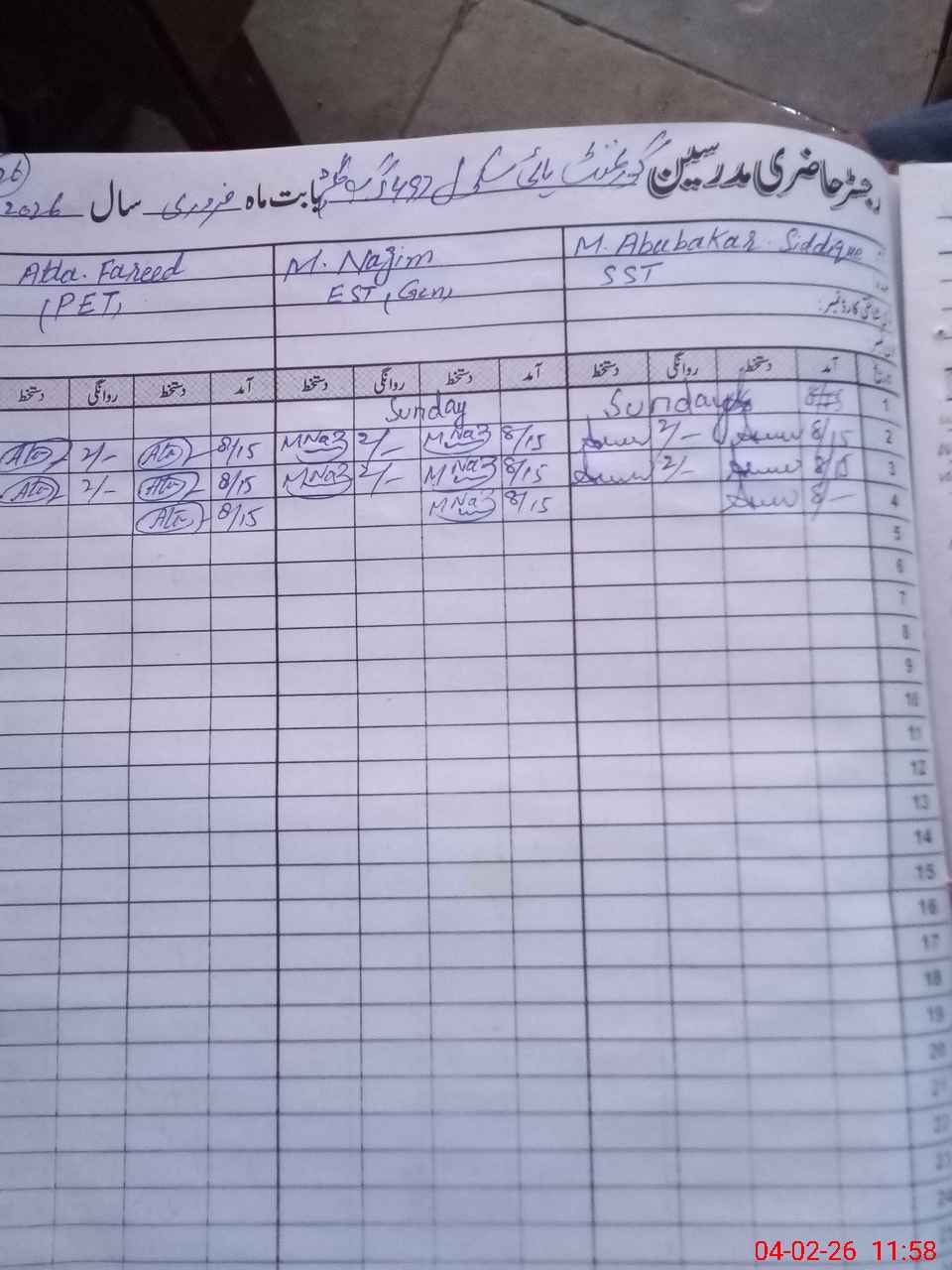 | CNIC | Full Name | Designation | R/C | Absence During Last Calender Month |
