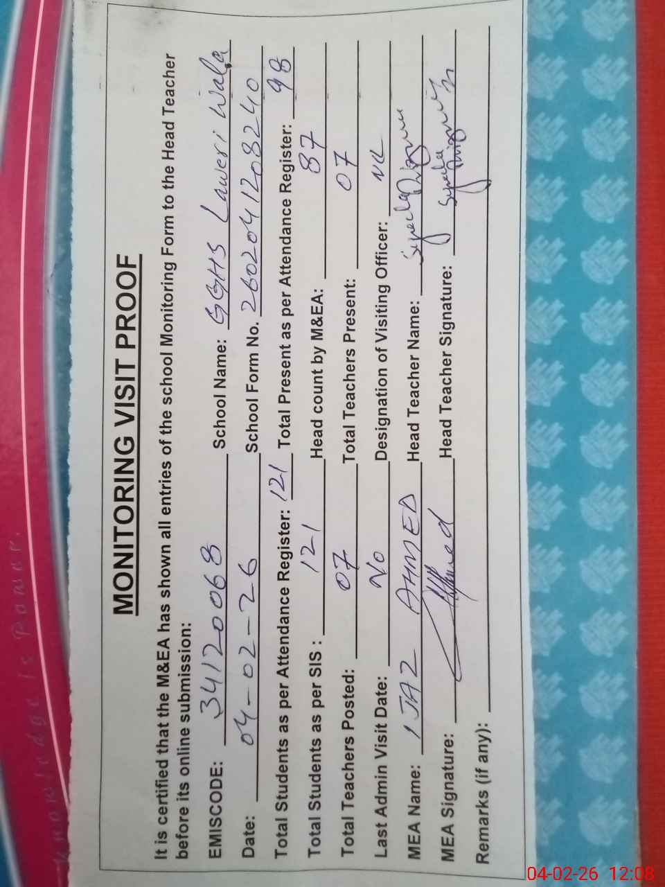 | Attendance Register | Head Teacher | MEA with School | Visit Proof |