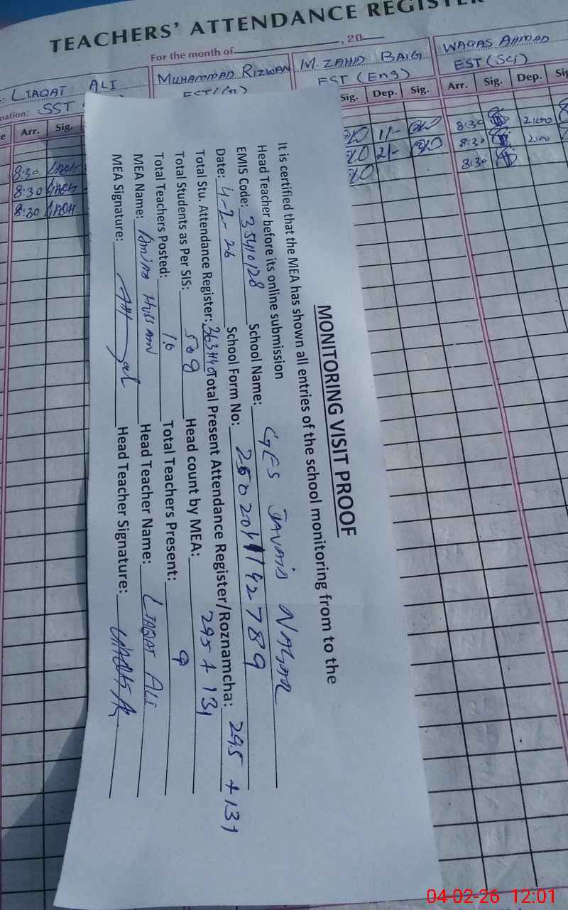 | EMIS Code: 35410128 | Name of School: GES JAVED NAGAR | |||