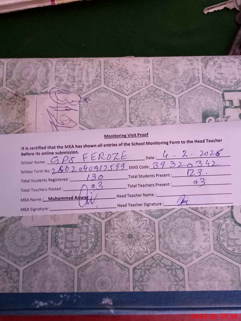 | Attendance Register | Head Teacher | MEA with School | Visit Proof |