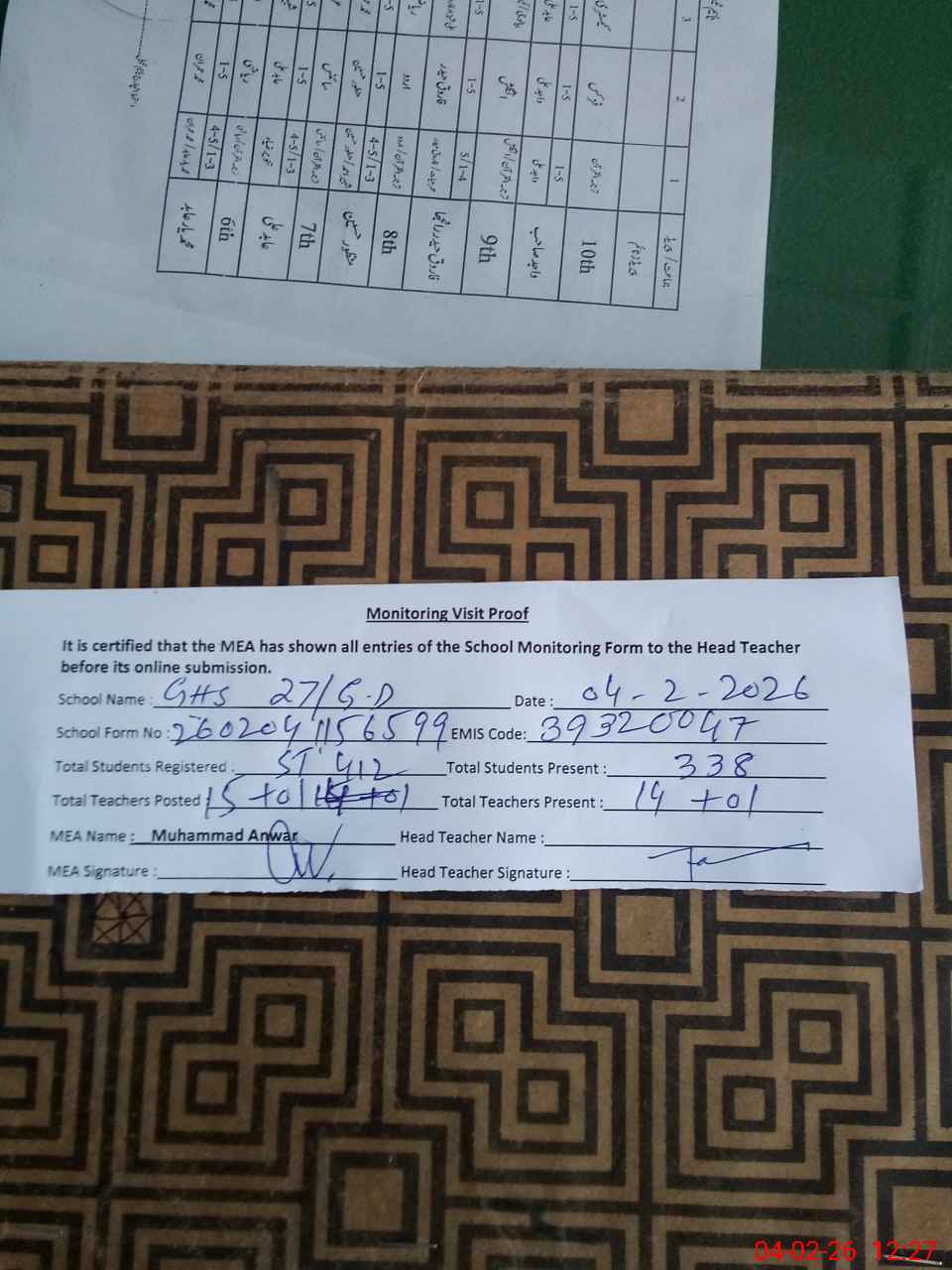 | Attendance Register | Head Teacher | MEA with School | Visit Proof |