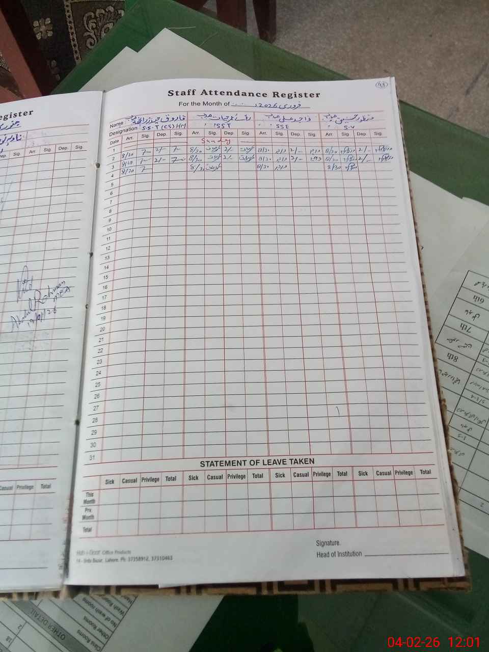 | CNIC | Full Name | Designation | R/C | Absence During Last Calender Month |