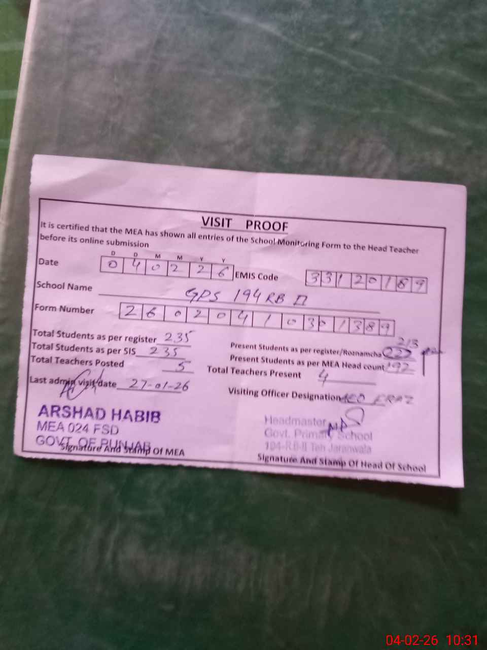 | EMIS Code: 33120189 | Name of School: GPS CHAK 194 RB II | |||