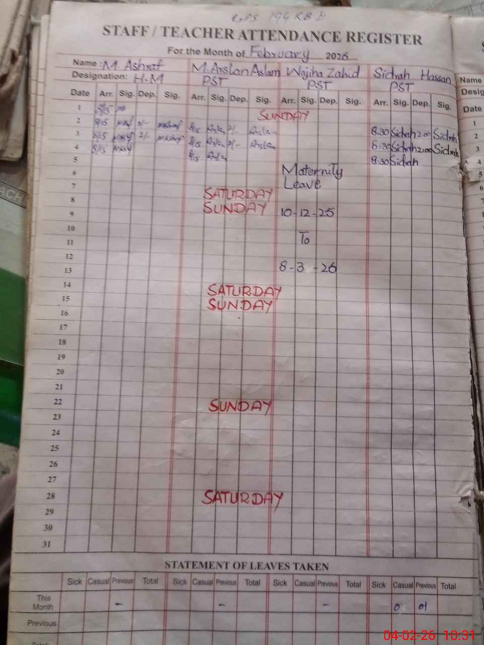 | 33**** | Wa**** Za**** | PST Science/Maths | Regular | 0 | 0 | 0 | 0 | 0 | 0 | 0 | 0 | 0 | Maternity |