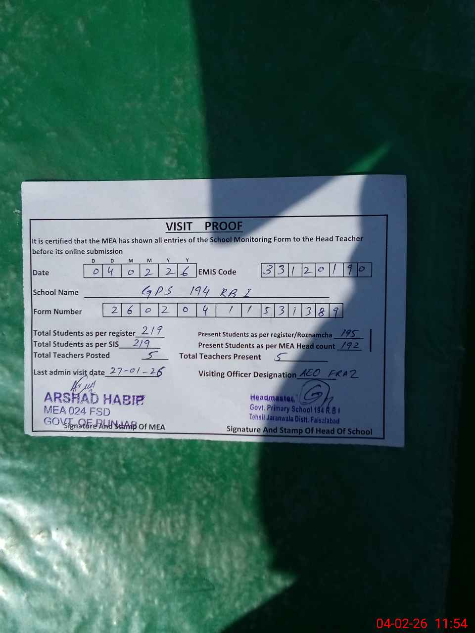 | EMIS Code: 33120190 | Name of School: GPS CHAK 194 RB I | |||