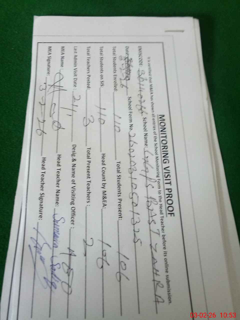 | Attendance Register | Head Teacher | MEA with School | Visit Proof |