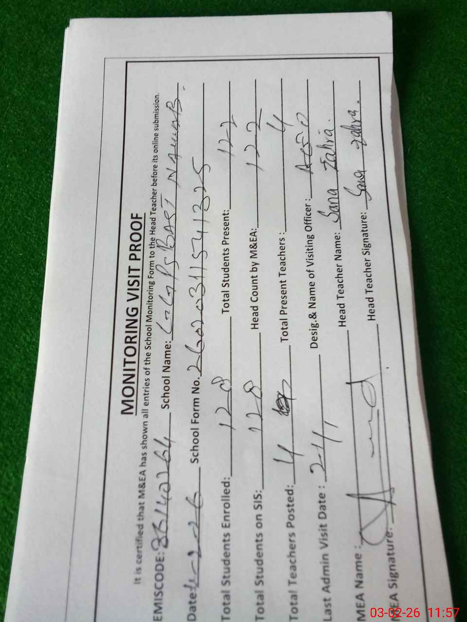 | Attendance Register | Head Teacher | MEA with School | Visit Proof |