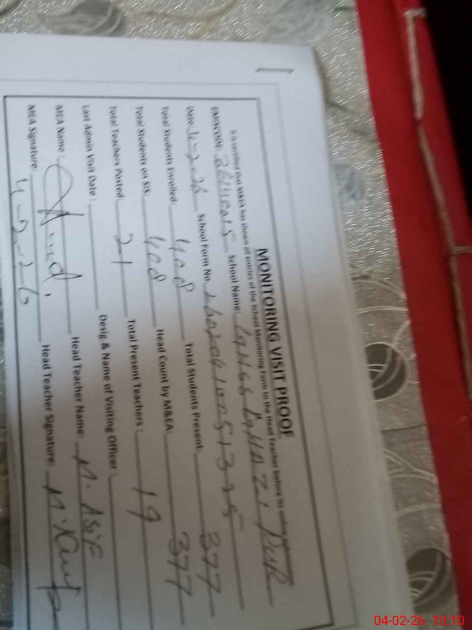| Certified that this School was Inspected by the Undersigned MEA/DMO Today and the Information Stated Above is as Per Record. | |||||