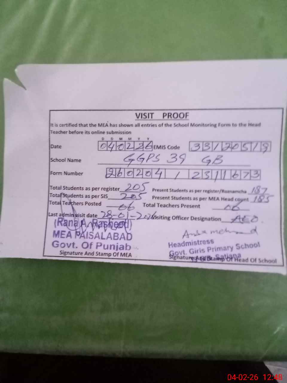 | Attendance Register | Head Teacher | MEA with School | Visit Proof |