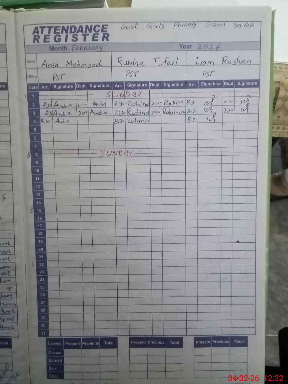 | CNIC | Full Name | Designation | R/C | Absence During Last Calender Month |