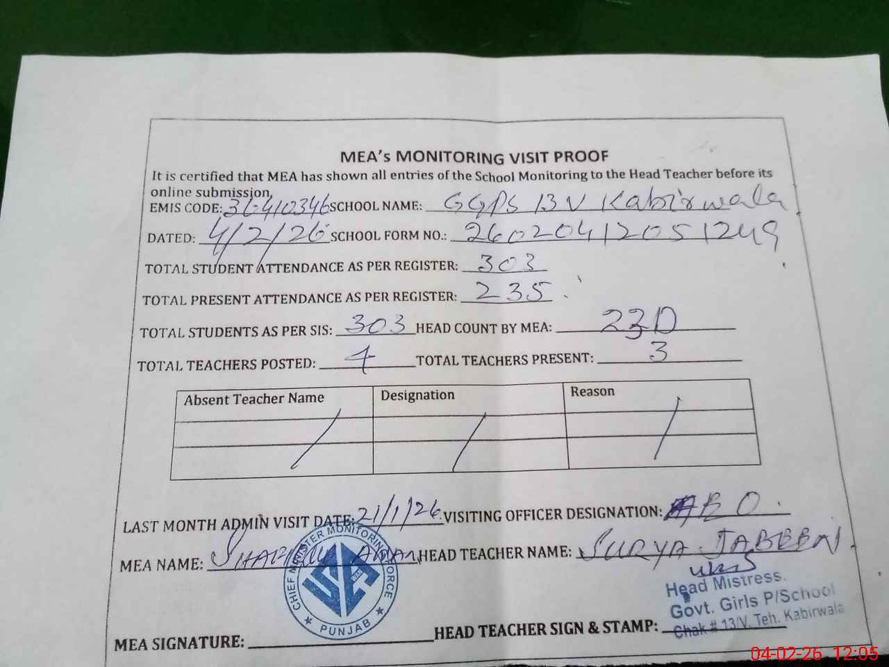 | Attendance Register | Head Teacher | MEA with School | Visit Proof |