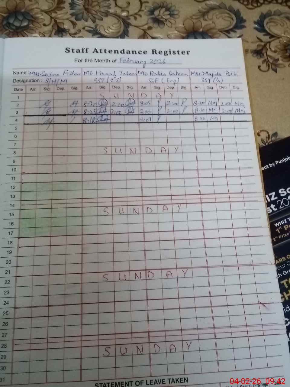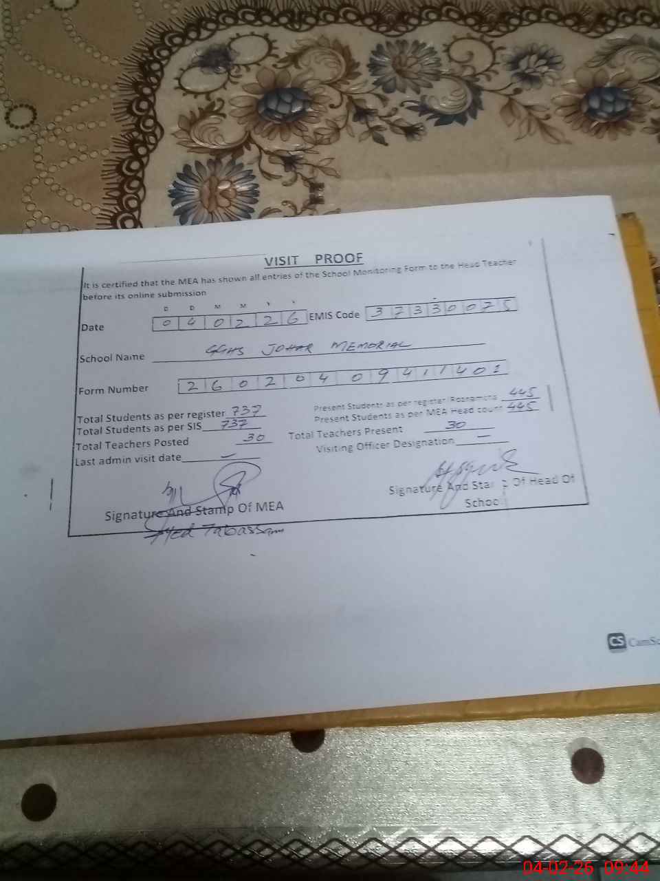 | Attendance Register | Head Teacher | MEA with School | Visit Proof |