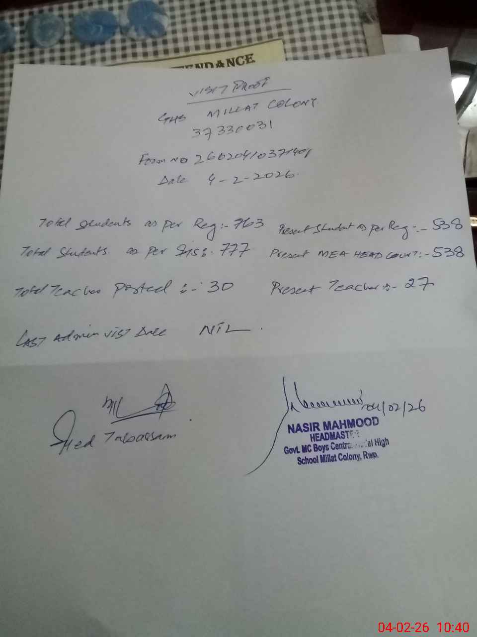 | Certified that this School was Inspected by the Undersigned MEA/DMO Today and the Information Stated Above is as Per Record. | |||||