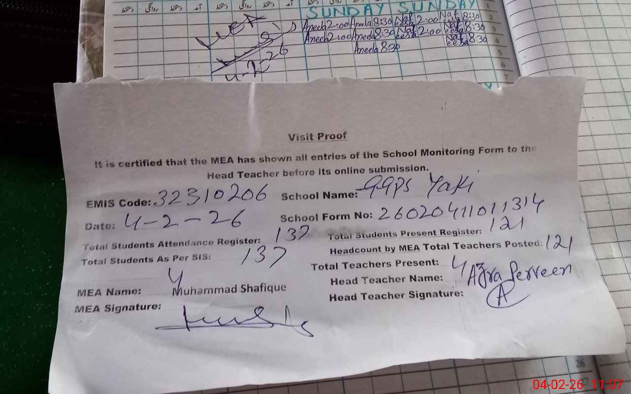 | Attendance Register | Head Teacher | MEA with School | Visit Proof |